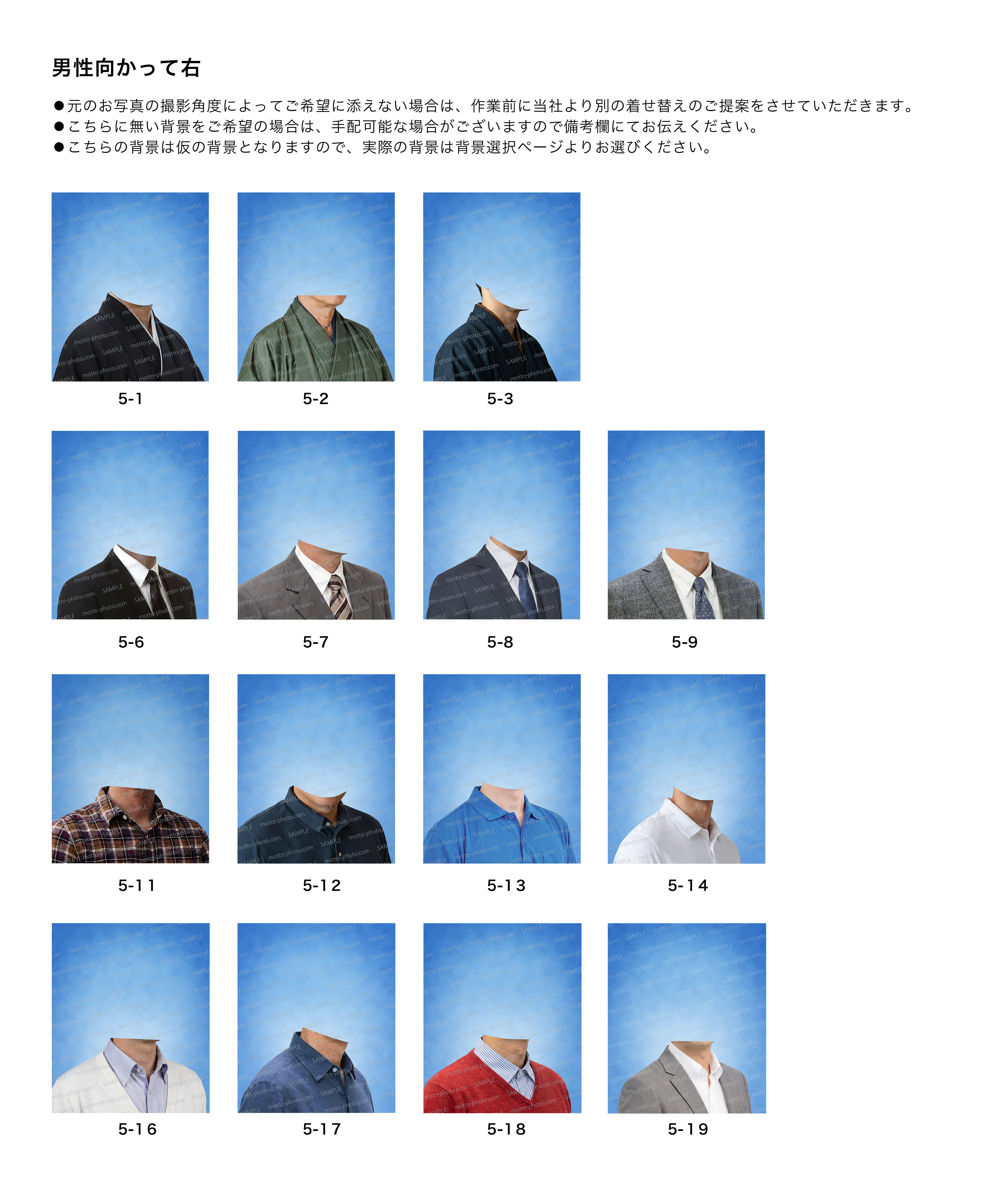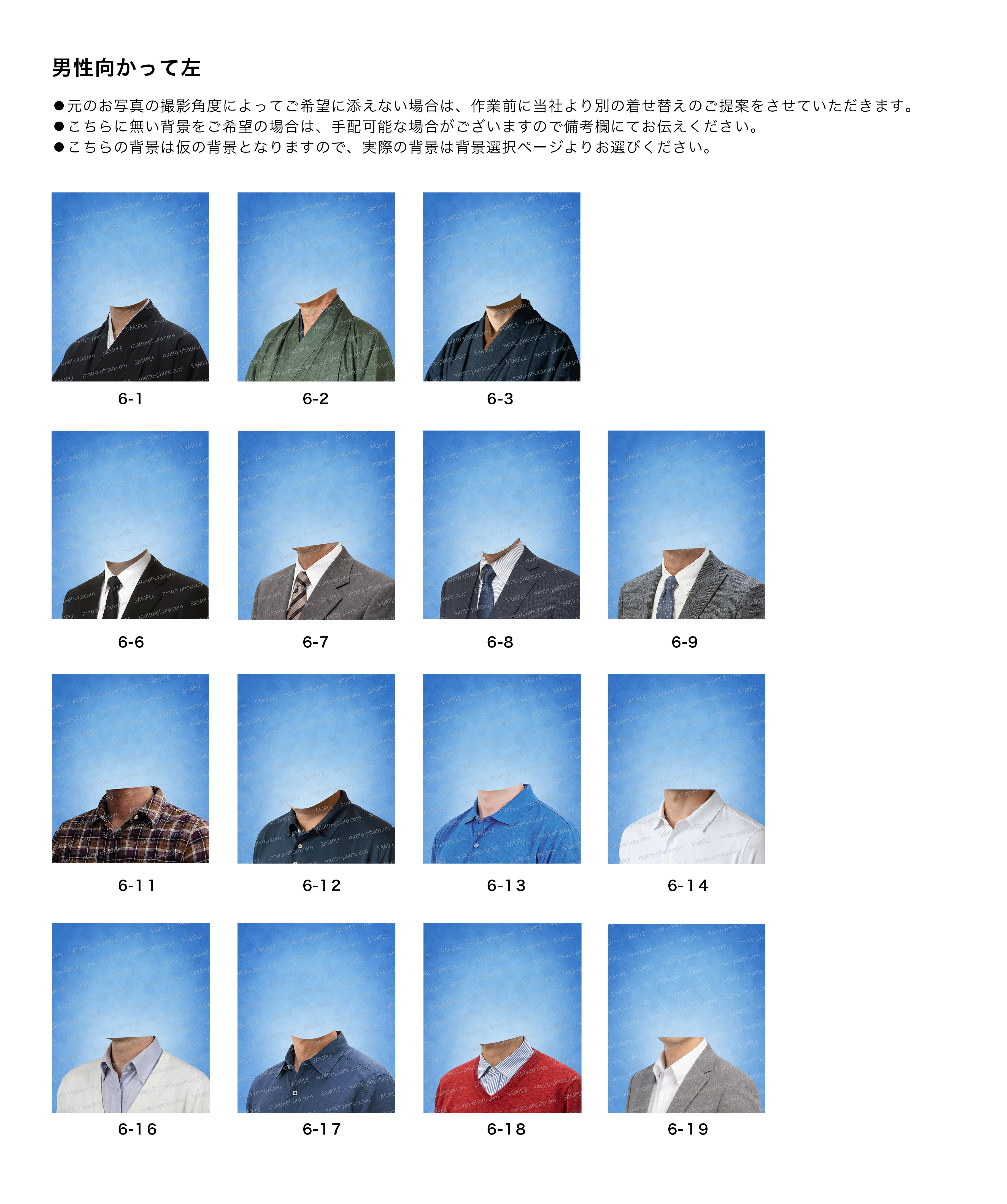 ・こちら以外の服装でご希望の服がございましたら、参考となる画像が掲載されているURLをお知らせいただくか、参考画像をinfo@motto-photo.comまでお送りください。