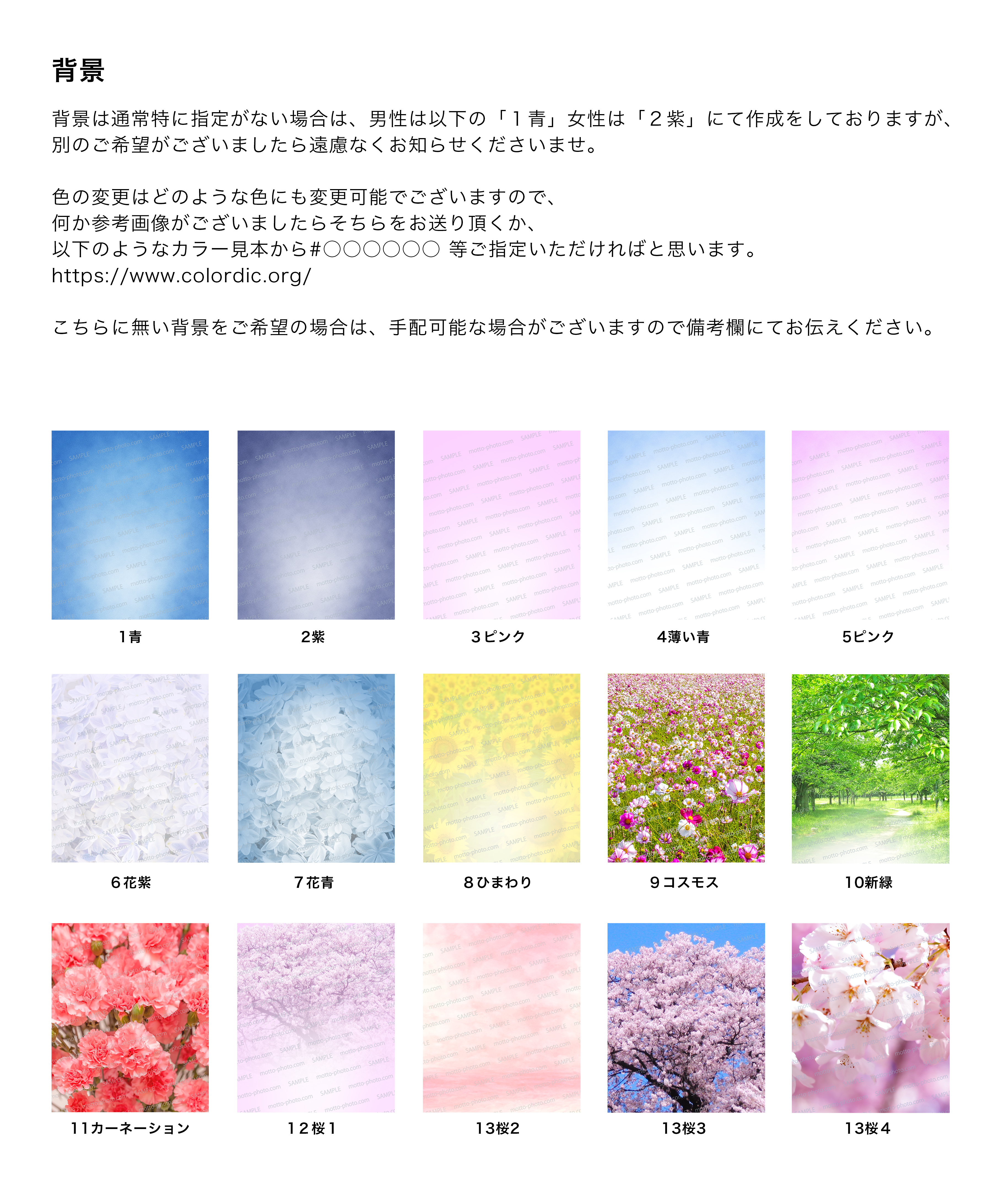 ・背景は通常特に指定がない場合は、男性は以下の「1青」女性は「2紫」にて作成をしておりますが、別のご希望がございましたら遠慮なくお知らせくださいませ。